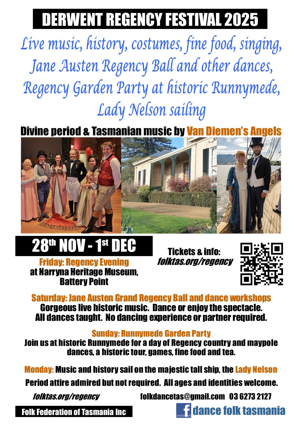 This is the opening event of the Derwent Regency Festival, 28th November - 1st December 2025: Celebrate the Regency era in style and fun with events including a Regency evening at Narryna Heritage Museum, dance workshops and a Jane Austen Grand Regency Ball in the fine St James Church Hall in New Town, a Garden Party of dancing, music, history and delicious period food in the fine garden of historic Runnymede, and a music and history sail on the majestic tall ship, the Lady Nelson. Four days of fun, food, fine music, dancing and general frivolity. This year we also have a bonus night of historically themed contra dancing on the Monday night. Further details here: https://www.folktas.org/regency
